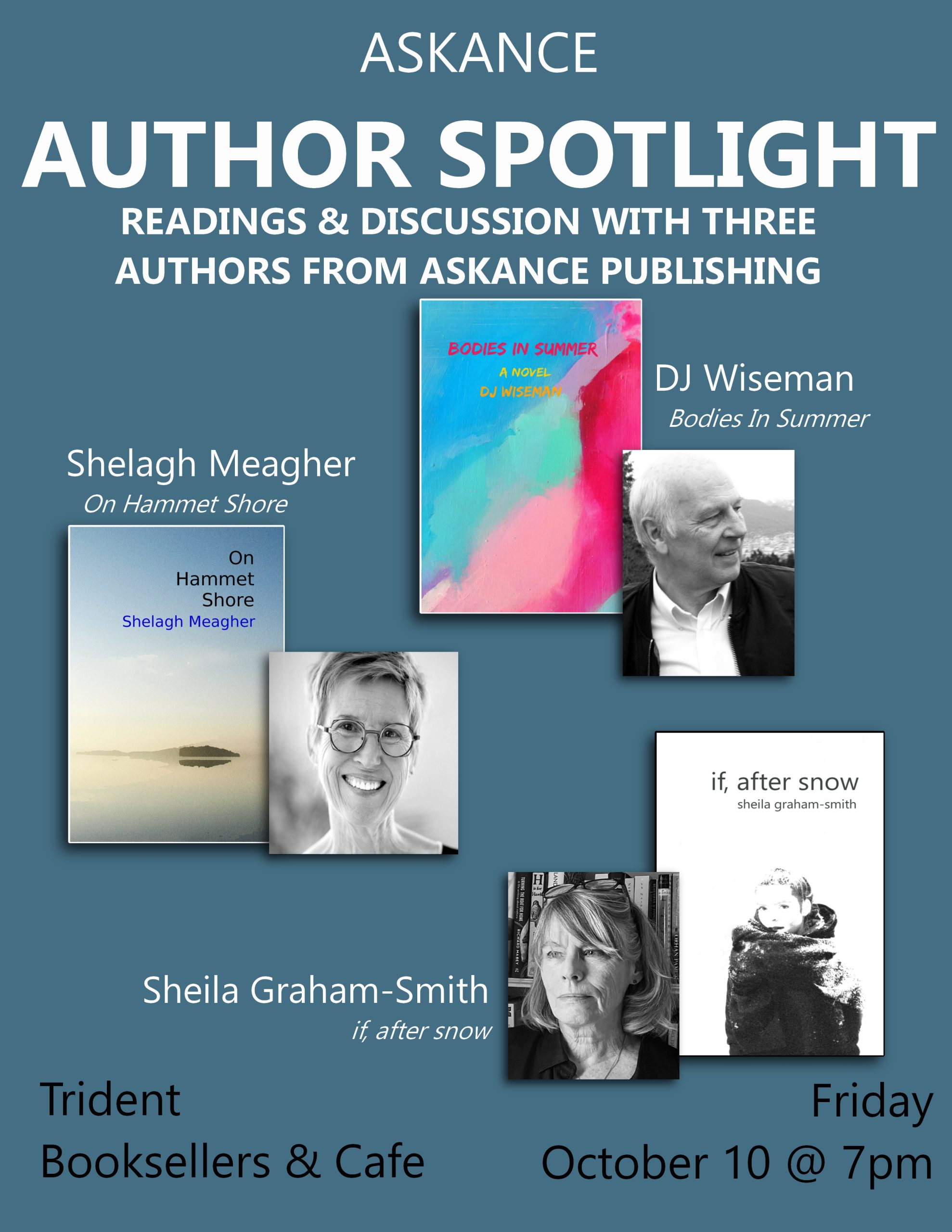 Join us for a spotlight on three of Askance Publishing’s authors: Sheila Graham-Smith, Shelagh Meagher, and DJ Wiseman. Reading, panel discussion, and books, books, books! Check them out below: