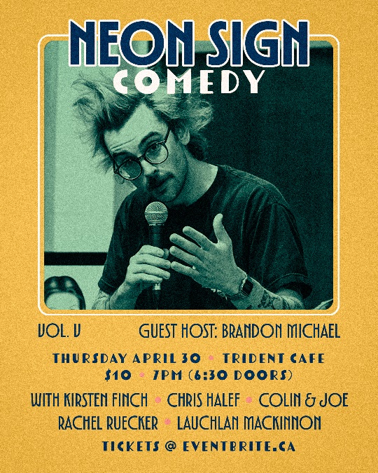 This month, we have guest host Brandon Michael, with comics Kirsten Finch, Chris Halef, Colin & Joe, Rachel Ruecker, and Lauchlan MacKinnon!