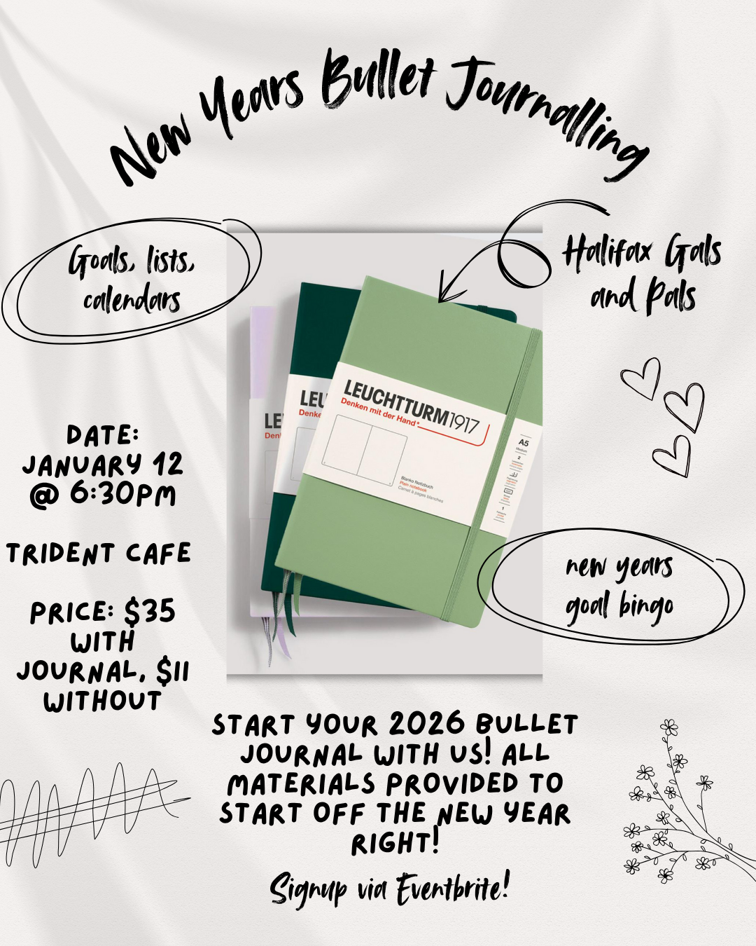 Join Halifax Gals & Pals for this bullet journaling party! Tickets are $35 including a journal, $11 if you bring you own, and includes materials, instruction, New Year's Goal bingo and more! Get tickets at Eventbrite now! When: Monday, January 12th 2026 @ 6:30pm Where: Trident Booksellers & Cafe, 1256 Hollis St. Halifax